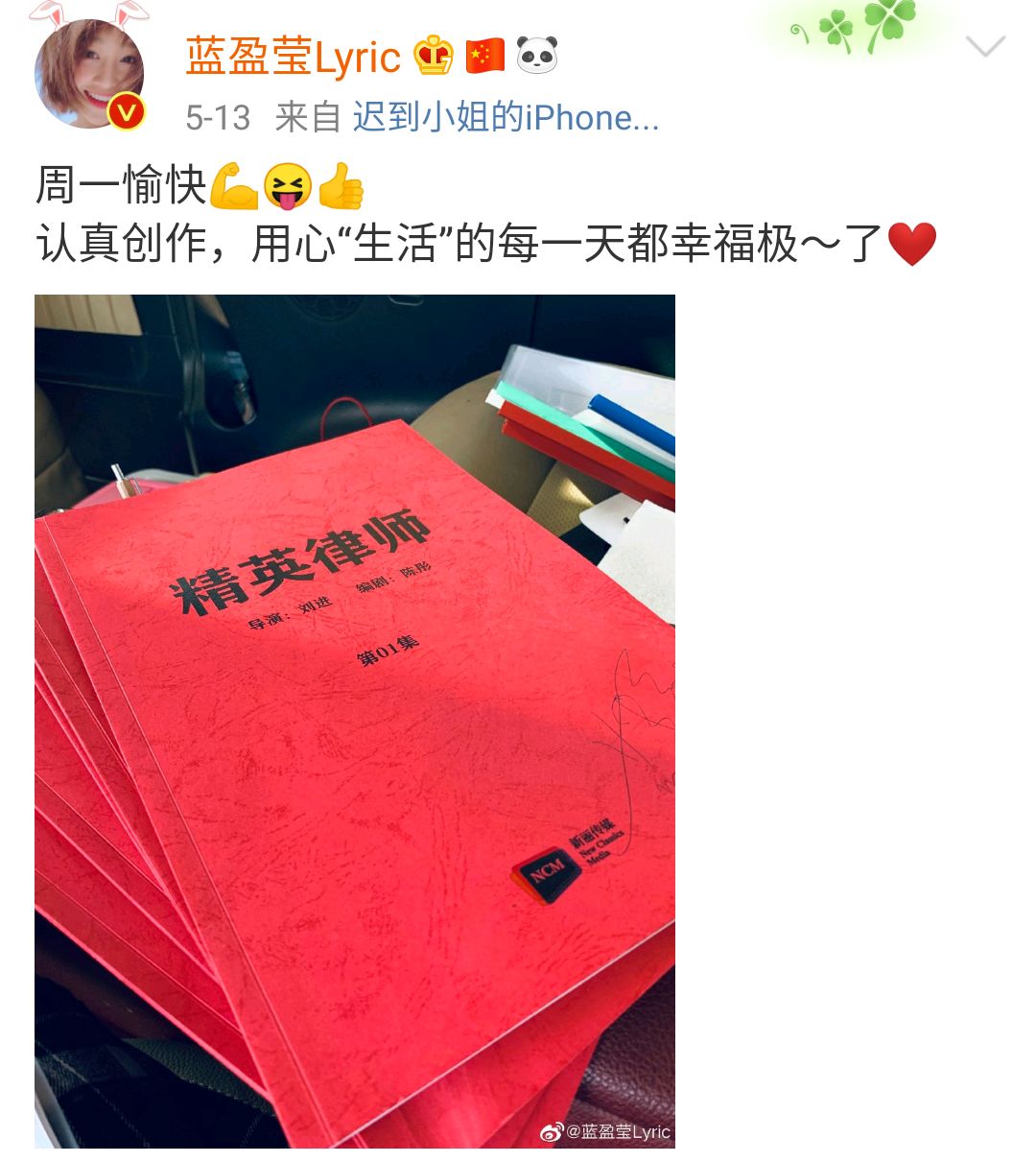 还有刚刚杀青不久的《精英律师》,她担纲女主角,搭戏演员则是靳东、刘敏涛。