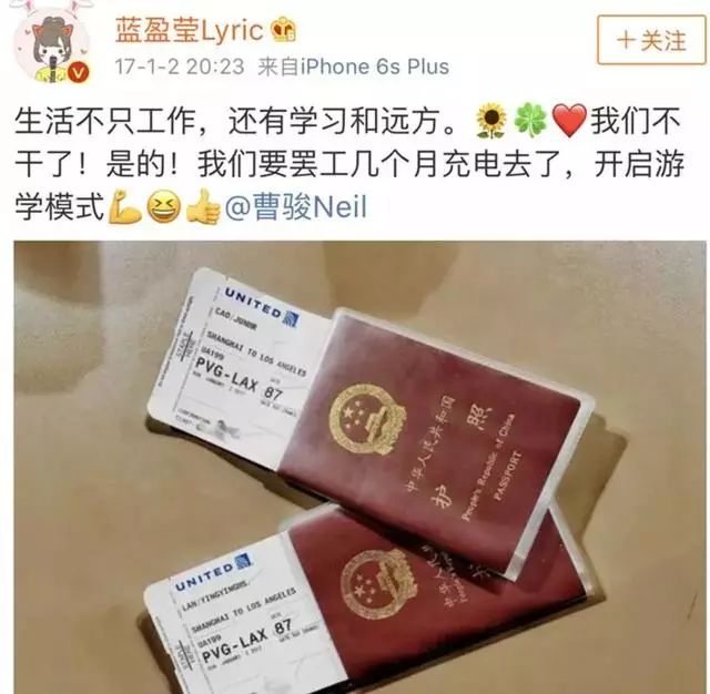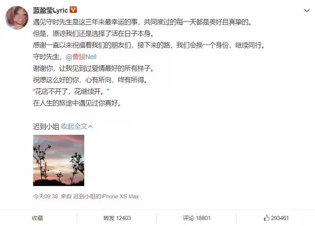 先是曹骏,在早上的时候发文:和迟到小姐在一起的日子,是难忘,值得回忆的时光,共同经历了许多有意义的时刻,我们彼此支持,相互鼓励,回想这些,是比什么都珍贵的。但对工作拥有无限热情的我们两人,陪伴彼此的时间越来越少,做回朋友也许是当下最好的选择。我从心里,依然支持着迟到小姐,祝愿蓝盈莹越来越好,我们都在各自的路上,越走越好,彼此祝福。非常谢谢一直以来祝福我们的朋友们。谢谢迟到小姐。守时先生。
