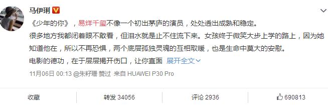 不仅粉丝和普通观众对易烊千玺在《少年的你》中的表现赞不绝口,连马伊琍刘嘉玲这样和他毫无交集的前辈戏骨,看完电影之后,都纷纷直发点评,毫不吝惜溢美之词,夸他沉稳,爆发力强,未来可期。这样一看,易烊千玺的大银幕首秀确实比同班王俊凯王源还要出众,希望以后能够更多好作品展示给大家,毕竟他才成年,还在中戏读大二,大好演艺前程才刚刚拉开序幕,相信未来还要很多精彩。