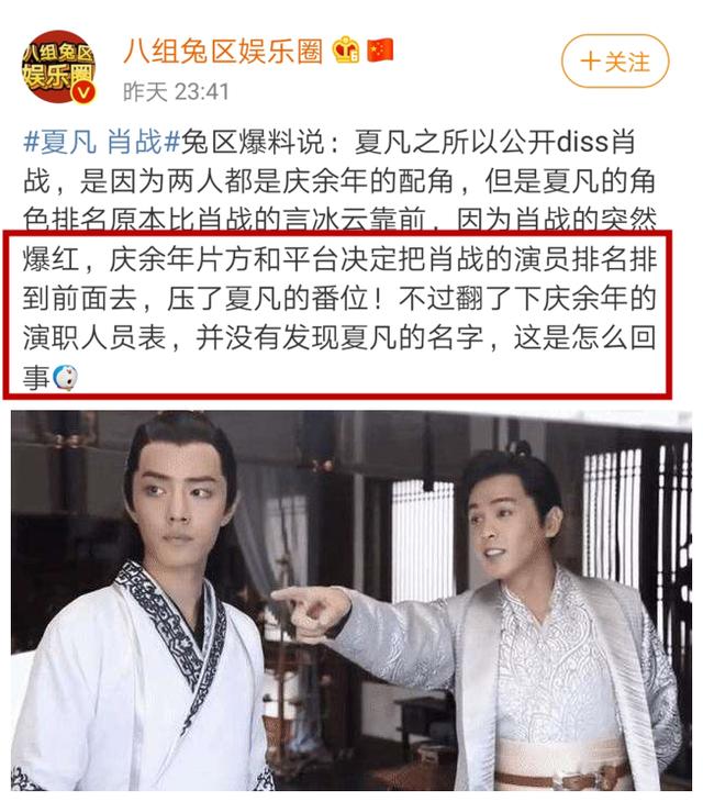 但因为肖战凭《陈情令》大火之后,马上要播出的《庆余年》就把肖战的演员排位,往前提升了不少,结果压番了夏凡,这让他很是不爽。
