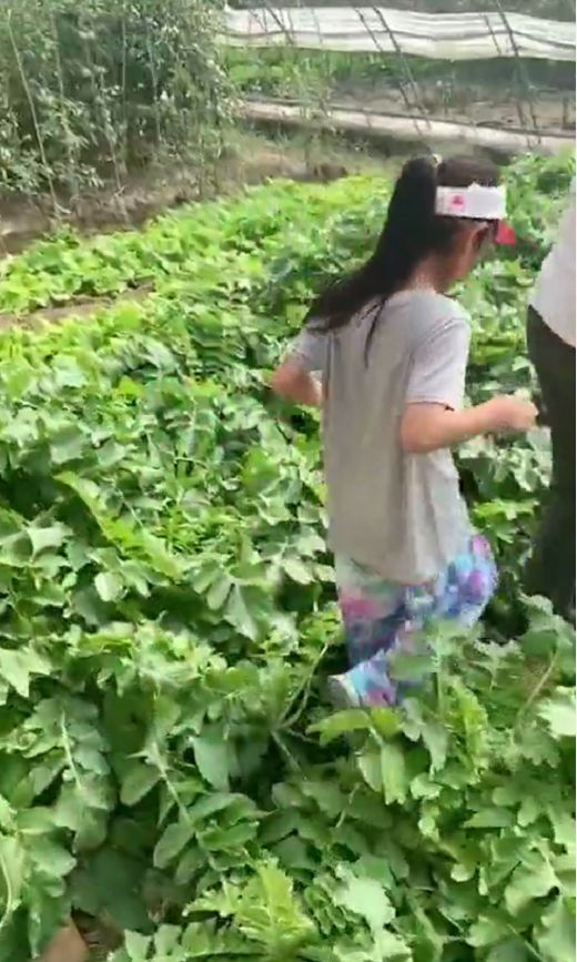 在视频中,小甜馨戴着遮阳帽,穿着宽松的T恤下身是一条花裤子,一会喂喂小兔子,一会直接下地干活,尽显“女汉子”的霸气风采。