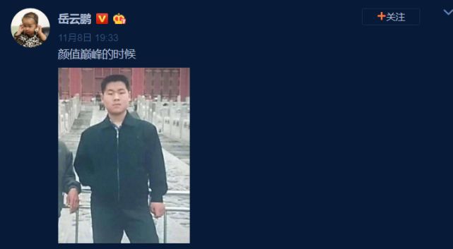 一直以来岳云鹏在社交平台上都极为活跃,经常晒出一些搞怪的自拍还爱拿自己跟吴彦祖对比,11月8日岳云鹏晒出了一张自拍声称是自己颜值巅峰的时候,引来网友的调侃“这颜值巅峰也不怎么样啊”。