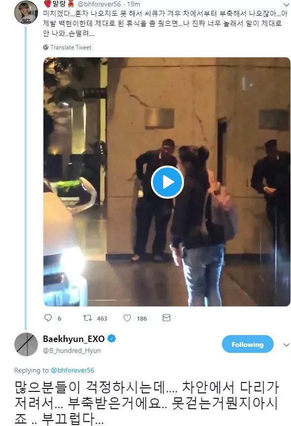 随后,伯贤本人亲自出面回应道:“其实是因为在车里腿麻了...才被扶着出来。”