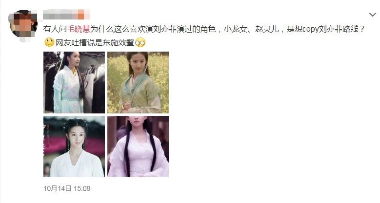 不仅如此,她先是扮演小龙女,再扮演赵灵儿,也被网友批评是在东施效颦,模仿刘亦菲。