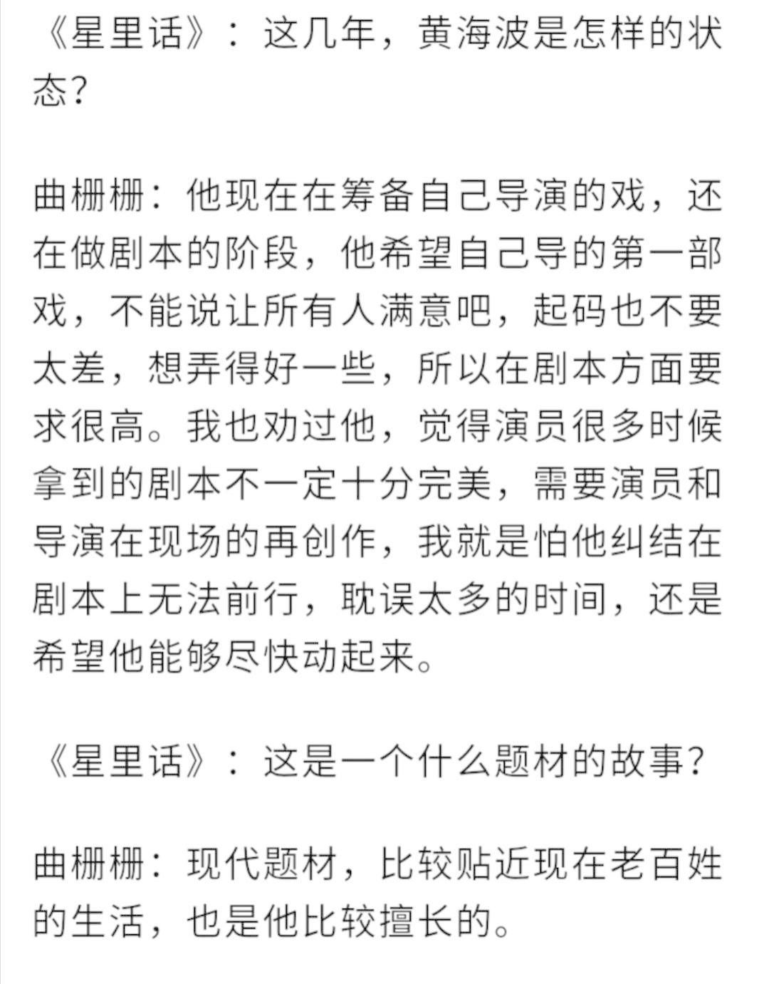 前段时间,曲栅栅还曾对媒体透露,黄海波有自己当导演的意向,正在筹备剧本。有网友表示,合理怀疑黄海波要以导演的身份复出,所以最近才会曝光率猛增。