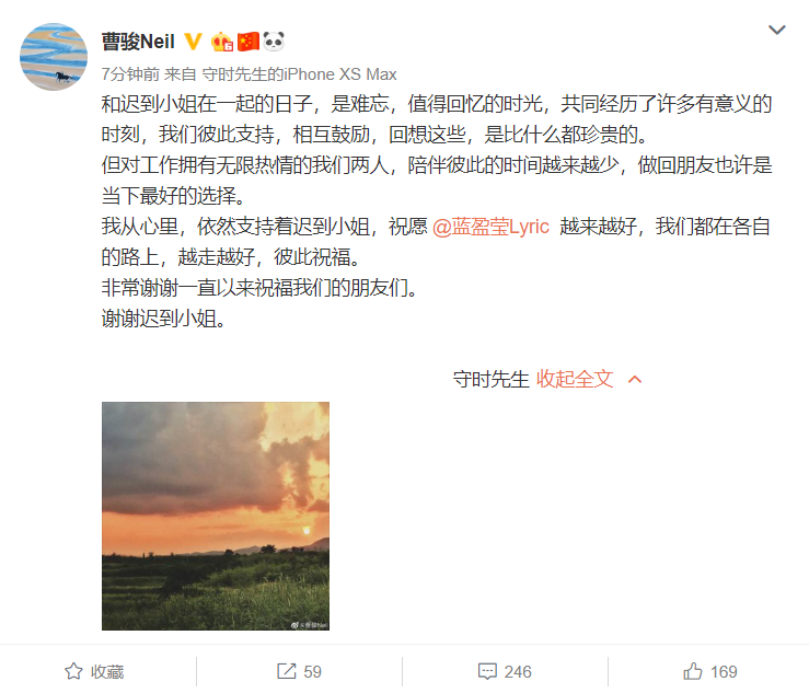 10月21日上午,演员曹骏在微博发文宣布与相恋三年的女友蓝盈莹正式分手,他称工作的原因让陪伴彼此的时间减少,做回朋友是当下最好的选择,未来还是会继续支持她,“和迟到小姐在一起的日子,是值得回忆的时光,共同经历了许多有意义的时刻,我们彼此支持相互鼓励,回想这些是比什么都珍贵的。”