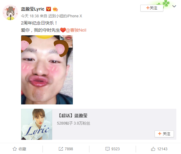 在两周年的当天,蓝盈莹也更新了微博:“2周年纪念日快乐!爱你,我的守时先生 ”,发个微博都要用相同的句式,一个迟到小姐,一个守时先生,感觉完全看到了两人约会时的幸福感啊。