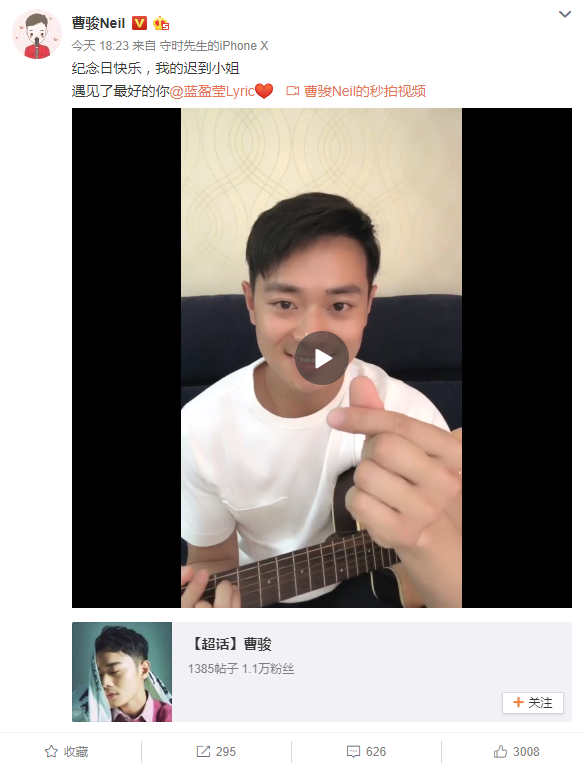 在蓝盈莹和曹骏恋爱的两周年纪念日,曹骏特意在微博上发布了一段短视频庆祝纪念日,曹骏称:“纪念日快乐,我的迟到小姐,遇见了最好的你”,视频中,曹骏为蓝盈莹自弹自唱情歌《为了遇见你》,唱得生动又饱含感情,而且在一曲末了,曹骏还隔空比心女友蓝盈莹:“纪念日快乐,有你真好,爱你”。