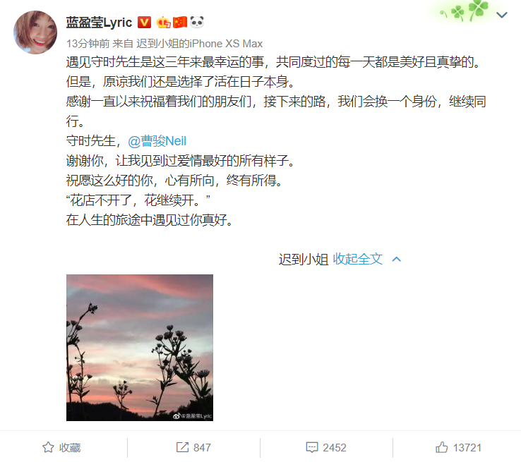 随后不久,蓝盈莹也更新微博,并以类似的文案回应称“遇见守时先生是这三年来最幸运的事,共同度过的每一天都是美好且真挚的。但是,原谅我们还是选择了活在日子本身。”