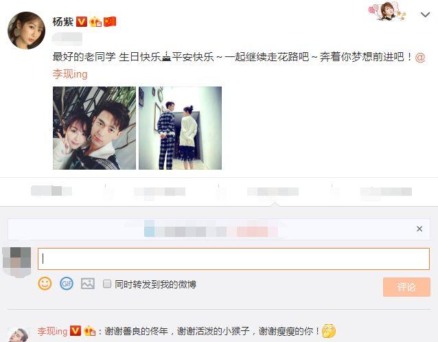 10月19日,李现迎来了他的28岁生日,粉丝们纷纷送上祝福,而“童颜夫妇”的“另一半”——杨紫,也发微博为李现庆生,并晒出二人的同框照,祝最好的老同学生日快乐。杨紫还说,“童颜夫妇”要一起走花路,李现在杨紫的留言下面回复时,亲昵地称呼杨紫为“小猴子”,“谢谢瘦瘦的你”。