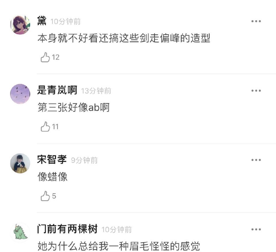 很多人觉得吴谨言本来就和杨颖长得挺像的,短发造型在有些角度看就更加像了。而且,吴谨言太瘦了,短发造型让她整个人看上去都会显得有些老气,并不是很好看。所以说,女艺人还是不要轻易尝试一些明明知道不好看的造型,网络记忆最后都变成了女明信的黑历史了。吴谨言这一次的短发造型就已经被很多人吐槽了,下次还是引以为戒吧。