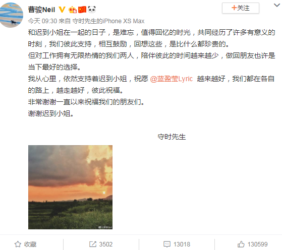 原标题:曹骏蓝盈莹公开宣布分手消息,两人曾先后暗示已经分手从头