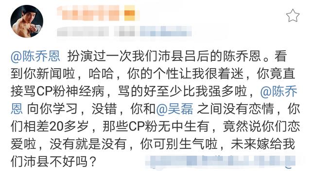 日前飞龙就与知名女艺人陈乔恩隔空传话,希望陈乔恩不要在意吴磊粉丝的言论,如有可能也可以考虑和自己结为夫妻:“陈乔恩,扮演过一次我们沛县吕后的陈乔恩。看到你新闻啦,哈哈,你的个性让我很着迷,你竟直接骂CP粉神经病,骂的好!至少比我强多啦,陈乔恩,向你学习,没错,你和吴磊之间没有恋情,你们相差20多岁,那些CP粉无中生有,竟然说你们恋爱啦,没有就是没有,你可别生气啦,未来嫁给我们沛县不好吗?”