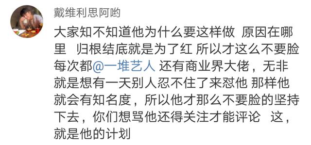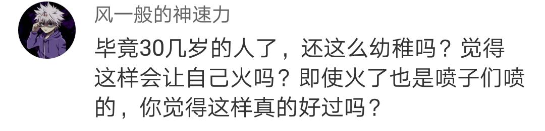 对此,网友们也纷纷留下了各自的看法:“您好,我是大铁棍子医院的佟主任,有需要可以联系我。”、“说实话,你这社交平台呀,从上到下就这个头像还可以”、“大家知不知道他为什么要这样做?原因在哪里?归根结底就是为了红!所以才这么不要脸,每次都圈中一堆艺人还有商业界大佬,无非就是想有一天别人忍不住了来怼他,那样他就会有知名度,所以他才那么不要脸的坚持下去,你们想骂他还得关注才能评论,这,就是他的计划”、“毕竟30几岁的人了,还这么幼稚吗?觉得这样会让自己火吗?即使火了也是喷子们喷的,你觉得这样真的好过吗?”、“神经病。简直是有毛病。”