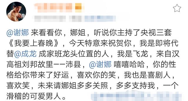 随即,飞龙又对女艺人谢娜进行喊话:“谢娜,来看看你,娜姐,听说你主持了央视三套《我要上春晚》,今天特意来祝贺你,我是即将代替成龙成家班龙头位置的人,我是飞龙,来自汉高祖刘邦故里——沛县,谢娜,嘻嘻哈哈,你的性格给你带来了好运,喜欢你的笑,我也是喜剧人,喜欢笑,未来请娜姐多多关照,多多支持我,一个滑稽的可爱男人。”