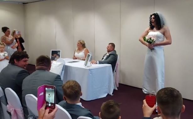 【环球网综合报道】据英国《镜报》10月17日报道,近日,英国一位新娘林赛•霍尔盖特雇了一位变装演员雷吉娜,让他身穿婚纱,手拿花束,伴着背景音乐——《本该是我》突然现身在自己的婚礼上,来恶搞她的未婚夫。