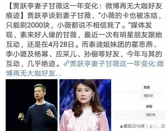 说到贾跃亭和甘薇的事情,当时乐视开始出现破产迹象的时候,就有新闻报道称甘薇从千亿集团身家的老板娘变成了银行卡只能刷2000块的普通人。