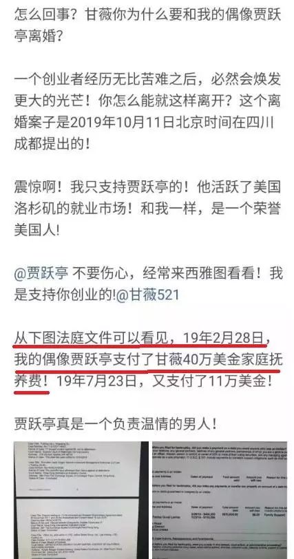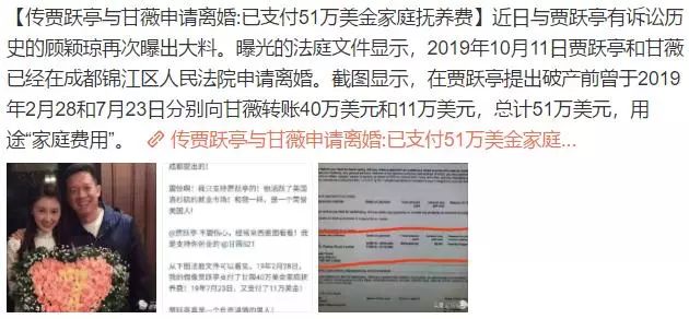 近日与贾跃亭有诉讼历史的顾颖琼再次曝出大料,曝光的法庭文件显示,2019年10月11日贾跃亭和甘薇已经在成都锦江区人民法院申请离婚,截图显示,在贾跃亭提出破产前曾于2019年2月28和7月23日分别向甘薇转账40万美元和11万美元,总计51万美元,用途是"家庭费用"。