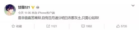 对于外界各种舆论压力,甘薇也是忍不住发过声:是非曲直苦难辩,自有日月道分明白衣惹灰土,只需心如故!