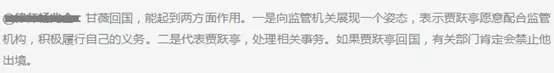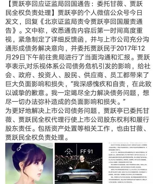 当时监证会发布了通告勒令贾跃亭回国,可他没回来,老婆甘薇一人独自返回,声称一切事务都由甘薇来处理,还表示会竭尽全力帮贾跃亭解决债务问题。