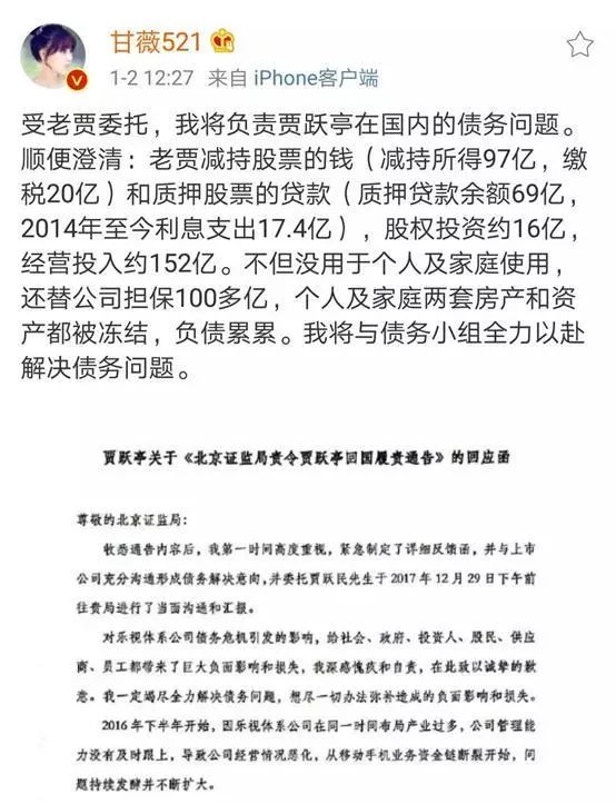 之后甘薇再次发声,表示会全权处理贾跃亭在国内的债务问题,然后还帮忙解释了贾跃亭手上的资金流向。