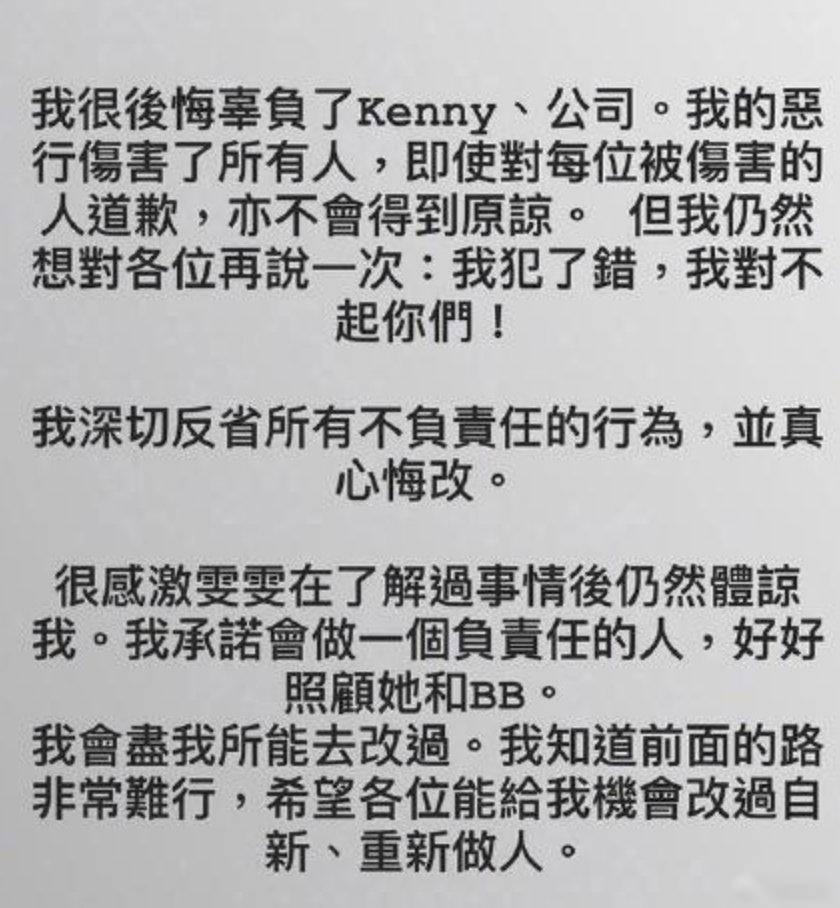 张致恒也扬言会回归家庭,修身养性,改过自身,直说自己犯了很大的错,对不起很多人,他诚心向她们道歉。