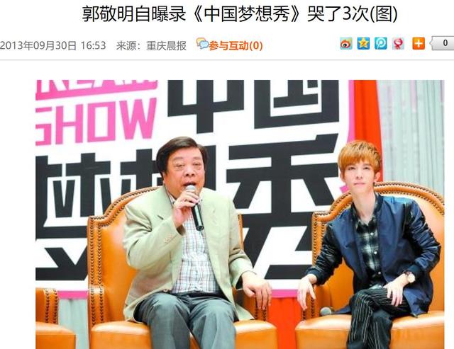 2013年9月,郭敬明录制《中国梦想秀》,赵忠祥、郭敬明和周立波等人一起担任梦想大使,接受采访时,郭敬明自曝录制过程中他前后哭了3次。