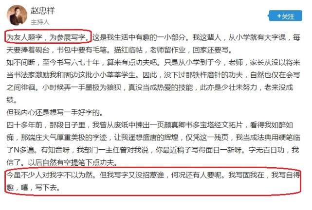 10月19日,赵忠祥正式在个人社交账号上发文正式回应了这件事。赵忠祥在文章开头的时候称:为友人提字,为参展写字。还在最后特意表明了自己的态度称:虽然很多人对我写的字不以为然,但我写字又没招惹谁。何况还有人要,还表示自己会一直写下去。