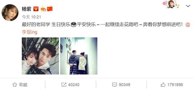 先是老同学杨紫率先发合影,甜蜜祝福李现:最好的老同学 生日快乐平安快乐~一起继续走花路吧~奔着你梦想前进吧!配了两张合影,两个人青春靓丽,关系很铁。