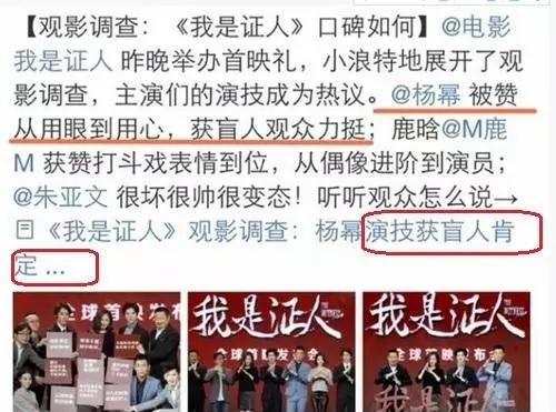 搞笑的是,当时《我是证人》上映时还出了一场乌龙,就是某浪娱乐发了这样一篇文章:《<我是证人>观影调查:杨幂演技获盲人肯定 鹿晗进阶偶像实力派》。
