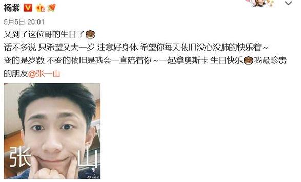 虽然毕业后这些年杨紫张一山各自事业很忙,很少合体聚会,但微博互动没有减少,特别是生日互送祝福互相调侃从没断过。