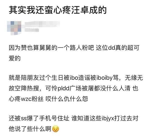 明明是一个很温馨的事情,汪卓成却被私生骂惨,甚至还是被私生暴露了电话号、住址等个人信息,受到不少来自私生饭的短信以及电话骚扰。疑似是因为前来庆生的是汪卓成而不是王一博,惹怒了“博君一肖”cp粉。
