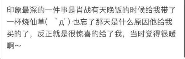 肖战给人的印象一直都是“暖男”的形象,很会照顾人,对身边的朋友更是暖暖的很贴心,有肖战的高中同学分享过跟他的相处提到,印象最深的一件事是肖战有天晚饭的时候给他带了一杯烧仙草,虽然忘了那天是什么原因给他买的,但是却很惊喜,很暖心。