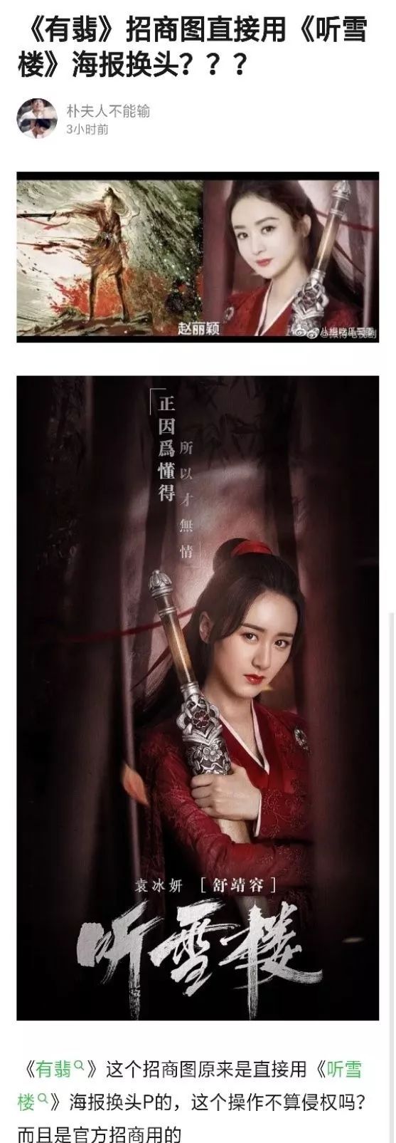 赵丽颖王一博合作新作《有翡》的招商海报,竟然被网友发现直接用了之前《听雪楼》的海报。