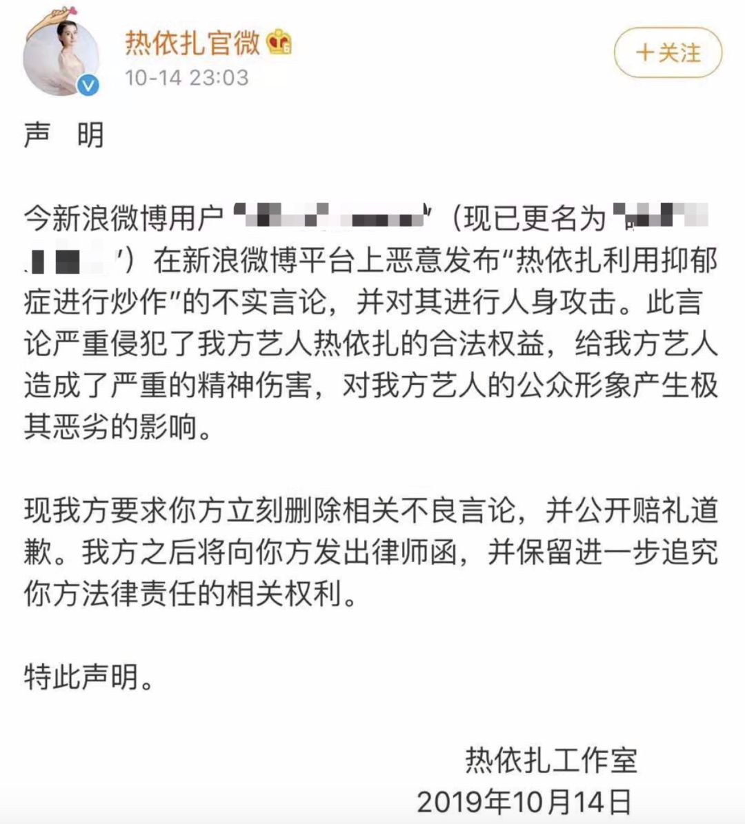 10月15日,热依扎工作室发表声明,向该网友发出了律师函。