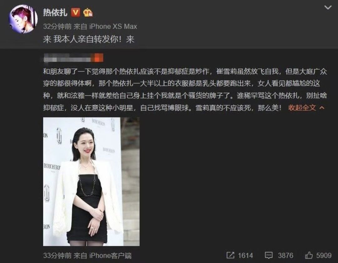 与此同时,“崔雪莉事件”也影响到了前不久公开自己患有抑郁症的热依扎。因为“吊带照”和“抑郁症”连连上热搜的热依扎,被网友抨击是“炒作性感不成,又借抑郁症上位”。而在热依扎怒斥其造谣后,有一名网友借着“崔雪莉事件”,反而给热依扎扣上了一顶“教唆粉丝进行网络暴力”的帽子。