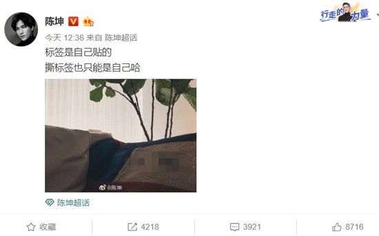 就在韩星悲剧还没彻底平息的时候。陈坤这点事也像在被媒体恶意放大,好在陈坤的形象和口碑一直很好,有瓜民就直接替陈坤辩解,明星又不是圣人,虽然不合适,不是中国很正常的一种现象吗?而且视频模糊成这样,有人说未必就是陈坤。随后陈坤在网上发了一句话,也有点一语双关:标签是自己贴的,撕标签也只能是自己哈。感觉里也像是在劝慰同行:不管是好的坏的标签,就算是被当成污点攻击,更多的也是自己的责任,只是好的标签可能撕掉很容易,坏的标签起来就很难。就如黑起来容易白起来很难一个道理。只是很多时候靠自己的努力,照样可以从新来过。