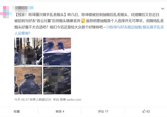 在韩星悲剧之后,华人娱乐圈也有不少明星发声,不过看着这些发声的明星大都是受到过网路语言霸凌的,其实真正受到网络攻击的明星自身的形象和口碑可以说都不是很好。因为言行曾经被贴上各种的标签,这些标签就会成为被攻击的理由。比如说有人私生活不检点,这样的标签就像是污点,这些标签真真不是一个键盘侠就可以贴上的。近日,陈坤曾被拍到抽烟后乱丢烟头,经提醒后,17号网上再度被拍到与好友“吞云吐雾”后将烟头随意丢弃,于是有人媒体就开始拿这样的行为说事:虽然明星抽烟是个人选择并无可厚非,但随地乱丢烟头好像不太合适吧?