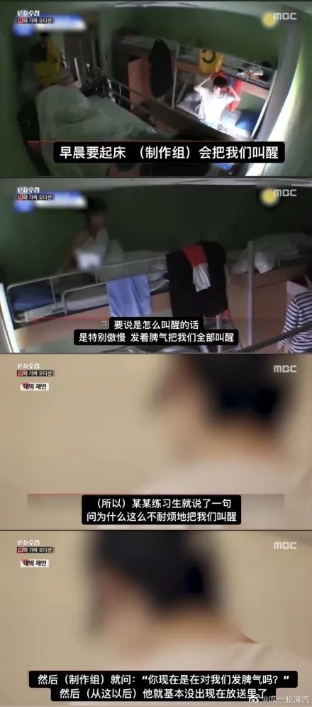 更严重的是,期间有一位练习生在早晨起床时抱怨过节目组一句:“为什么要这么发火地叫我们呢?我们明明已经在起床了。”工作人员竟回:“你是在对我们生气吗?”