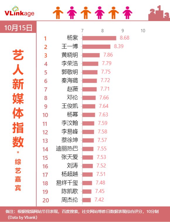 【寻艺指数】10月15日#艺人新媒体指数#(综艺嘉宾)Top 20榜单:#杨紫#,#王一博#,#黄晓明#,排名前3位,#李荣浩#,#郭敬明#,#秦海璐#,分列4、5、6位。