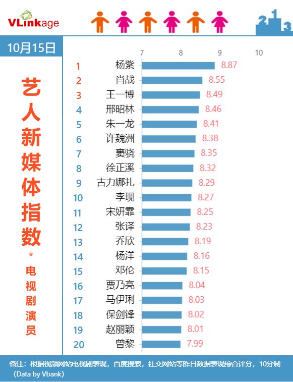 【寻艺指数】10月15日#艺人新媒体指数#(电视剧演员)Top 20榜单:#杨紫#,#肖战#,#王一博#,排名前3位,#邢昭林#,#朱一龙#,#许魏洲#,分列4、5、6位。