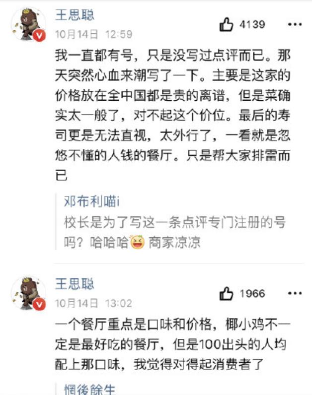 这顿饭王思聪花了15708元,他给这家店打了一星,留下了一长段评论:总体来说对于它的价位我只能给你给一分,食材还可以吧,但是店长居然向我撒谎说日本封海。服务很一般,用餐两个小时基本没换过热茶。心疼成都的朋友。