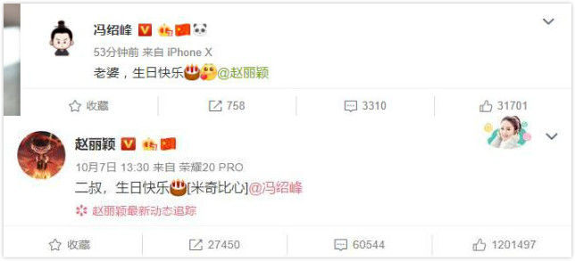 不过粉丝们从零点蹲到了早上,也不见冯绍峰对媳妇的祝福,一直喊话让他赶快出来为颖宝庆生。当天中午,冯绍峰终于在微博送出了祝福,发文“老婆,生日快乐!”。几天前正是冯绍峰的生日,赵丽颖发文:“二叔,生日快乐”。