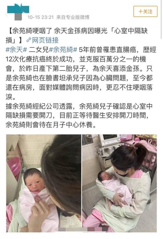 不过,命运又和余苑绮开了一个玩笑,近日,她在自己的社交平台上坦诚,儿子因为心脏问题,至今都还在病房。这个消息得到了余苑绮经纪公司的确认,据公司透露,余苑绮的儿子确认为心室中隔缺损,需要开刀,目前正在等待医生安排手术。