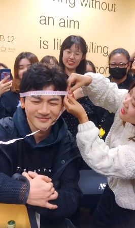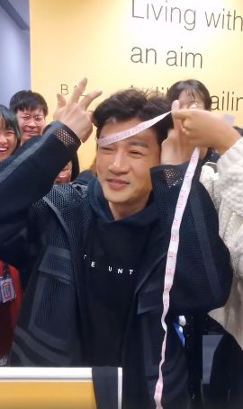 女孩儿又重新开始测量,苏有朋把头发撩起,大概是因为头发的厚度会占据头围尺寸吧,亮出光亮的额头。第二次测试结果显示是61,苏有朋听后露出了开心笑容,对于这个结果也是默认了。他开心的站起来,和身边的人分享了他头围的趣事。