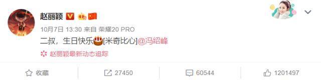 而且冯绍峰这样送祝福的方式,明显也是他和赵丽颖商量好的。不久前的10月7日是冯绍峰生日,赵丽颖送祝福时也是直接喊话老公:二叔,生日快乐。为对方送祝福的句式都如此一致,这种秀恩爱的方式对单身狗造成一万点伤害。