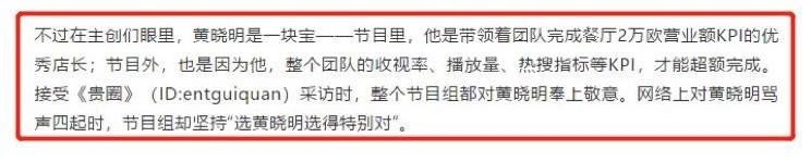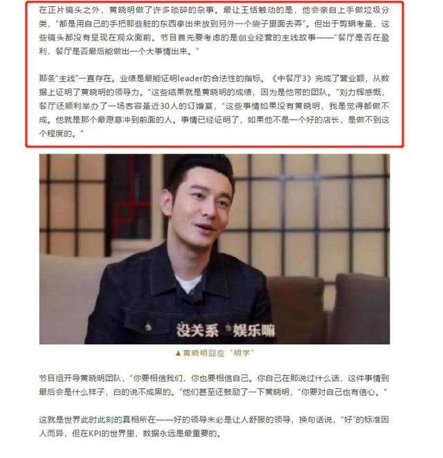 黄晓明能收获如此多的夸赞其实不无道理,早前中餐厅节目组在接受采访时就称:“黄晓明是一块宝——节目里,他是带领着团队完成餐厅2万欧营业额KPI的优秀店长;节目外,也是因为他,整个团队的收视率、播放量、热搜指标等KPI,才能超额完成。”,中餐厅本季也的确是因为黄晓明和明学而突破了传统综艺续作的桎梏,实绩不断,疯狂出圈。