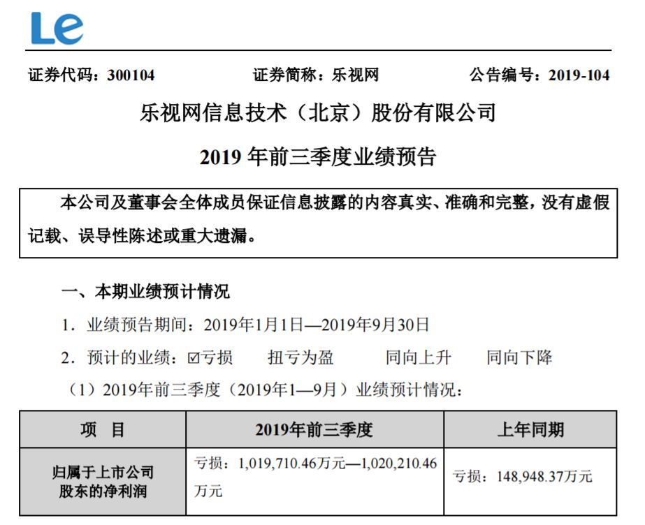 近日,乐视网发布公告称,预计前三季度亏损101.9亿-102亿,去年同期亏损14.9亿。