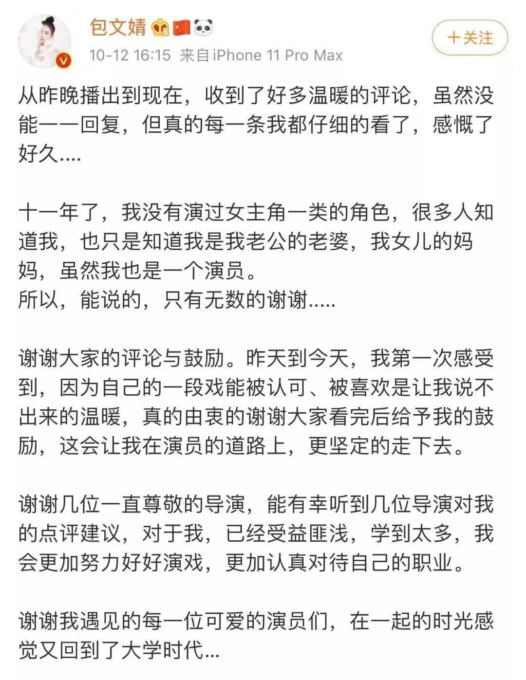 虽然近日包文婧发文称“十一年了,我没有演过女主角一类的角色,很多人知道我,也只是知道我是我老公的老婆,我女儿的妈妈,虽然我也是一个演员。”但她却一直在“小人物”中锤炼自己,才有了今天的绽放。若不是对表演的执着和努力,也不会有今天发光发热的自己。