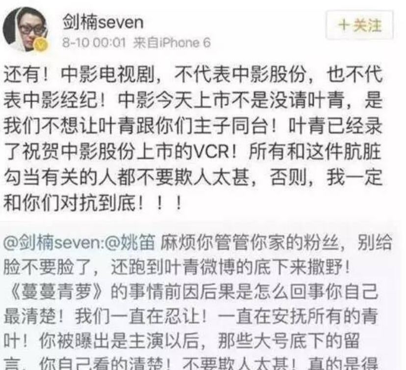 叶青被临时截胡的事还不止一件,经纪团队本来终于给她谈到一部大女主戏《蔓蔓青萝》,结果又一次遭到截胡,这次的截胡女主角是姚笛。角色被抢之后,怨愤交加的叶青在微博发了一通牢骚,其实她在微博里并没有指名道姓是谁抢了她的角色,却有不少姚笛粉丝对号入座主动加入战场,对其展开谩骂。